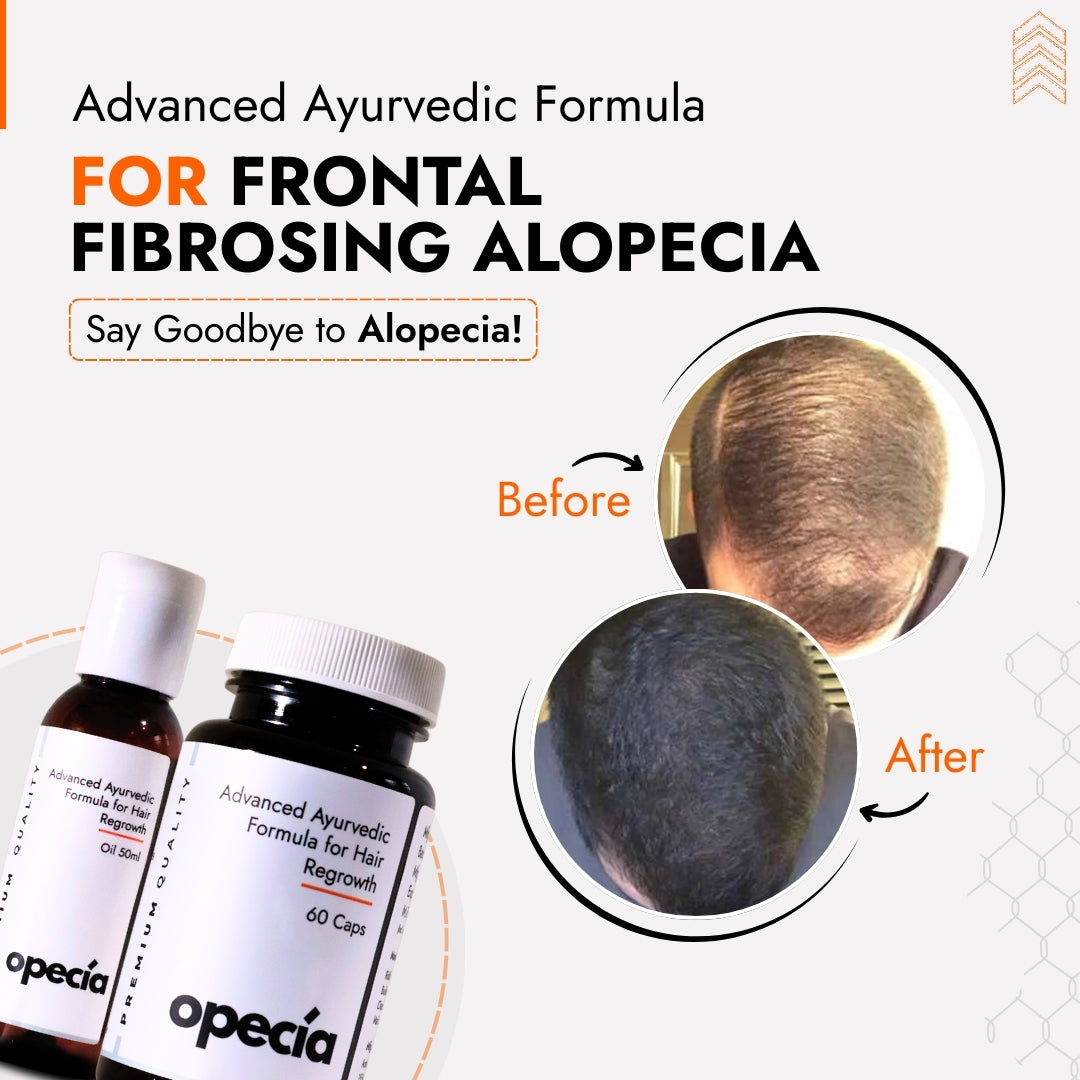 Opecia Ayurvedic Oil + Capsules is a targeted herbal solution specially crafted to manage receding hairlines, thinning, and hair loss caused by frontal fibrosing alopecia. This holistic formulation works by nourishing the hair follicles, calming inflammation, and stimulating natural regrowth in affected scalp areas. Designed with time-tested Ayurvedic herbs, the kit supports internal balance and strengthens scalp hair roots from within..