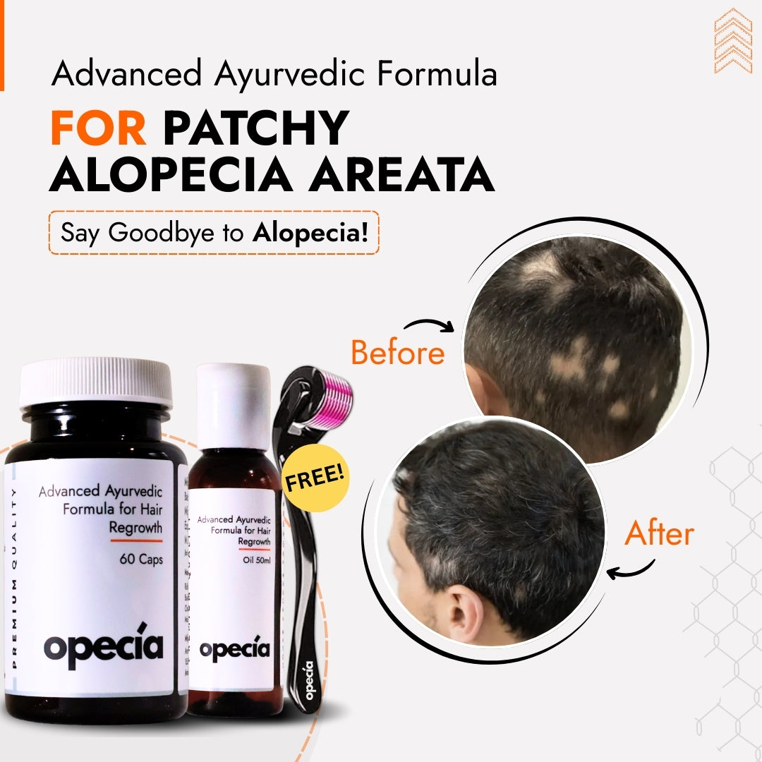 Opecia Ayurvedic Kit is a powerful natural formulation designed to help manage patchy alopecia—a condition where hair falls out in small, round patches. This holistic blend of oil and capsules works synergistically to stimulate dormant follicles, reduce inflammation, and revitalize scalp health. With consistent use, it supports visible regrowth, strengthens hair roots, and restores natural density from within.
